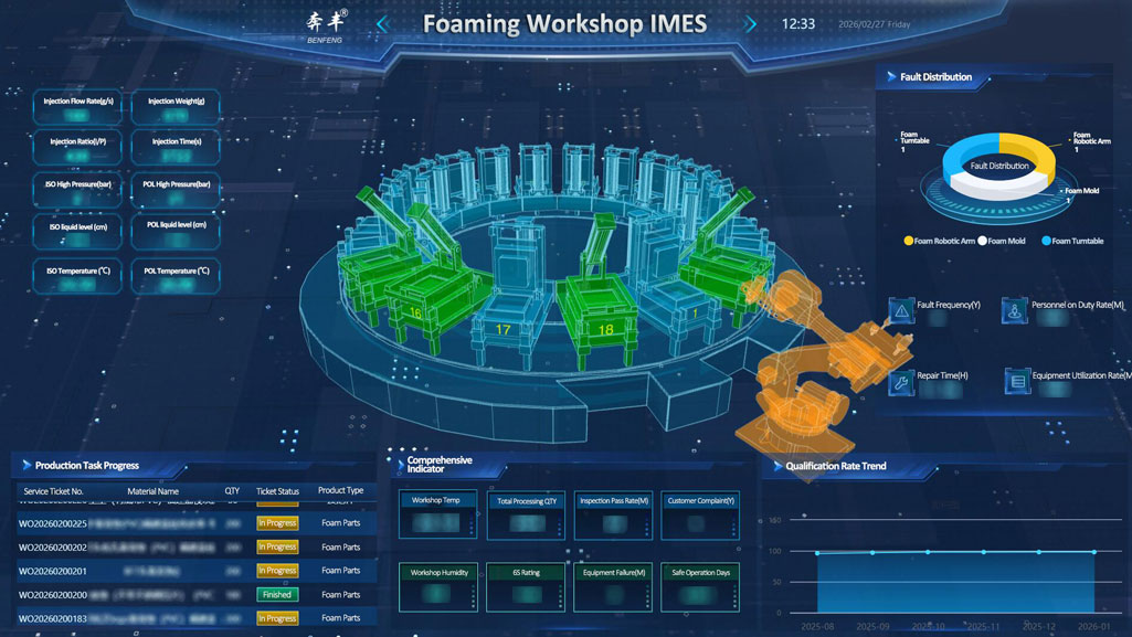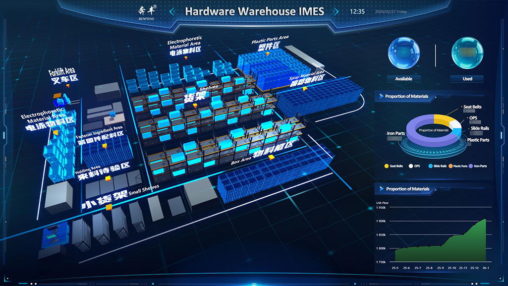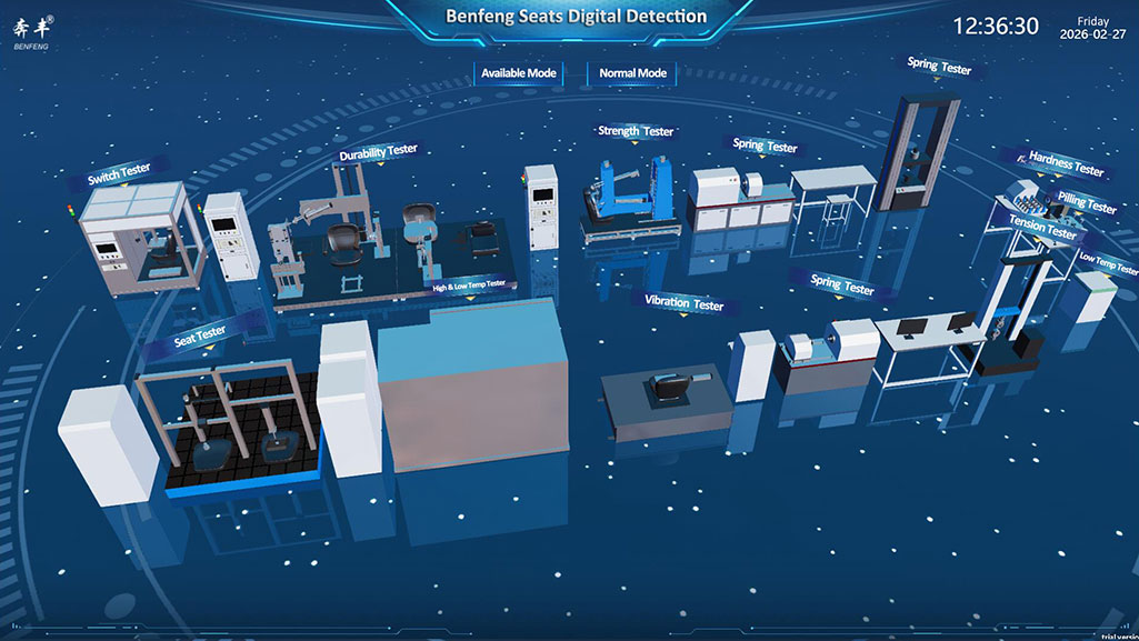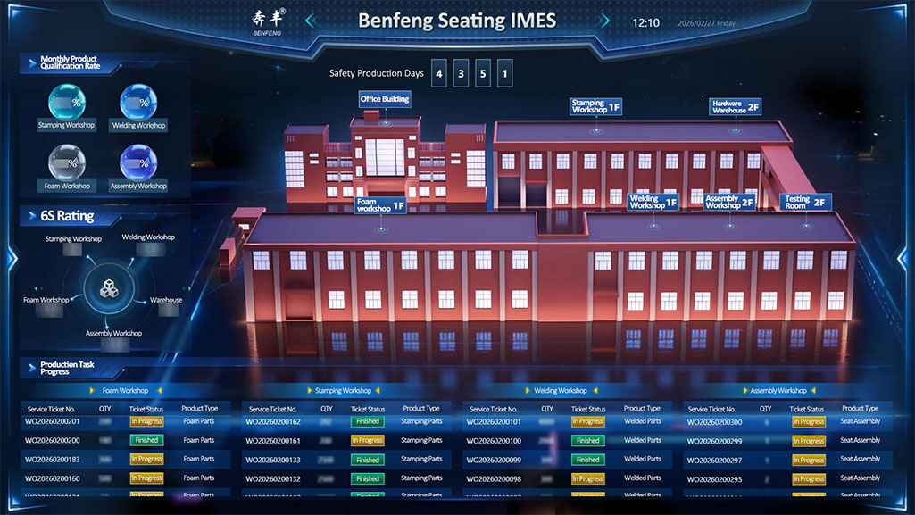 Laistigh den mhaitrís dhigiteach de Benfeng Suíocháin IMES (Ardán Déantúsaíochta Chliste Suíocháin Benfeng), tá an cheardlann cúrála, lena timpeallacht táirgthe ard-Chliste, ina chroí-thalamh cruthúnais maidir le feidhmíocht chompord suíochán.