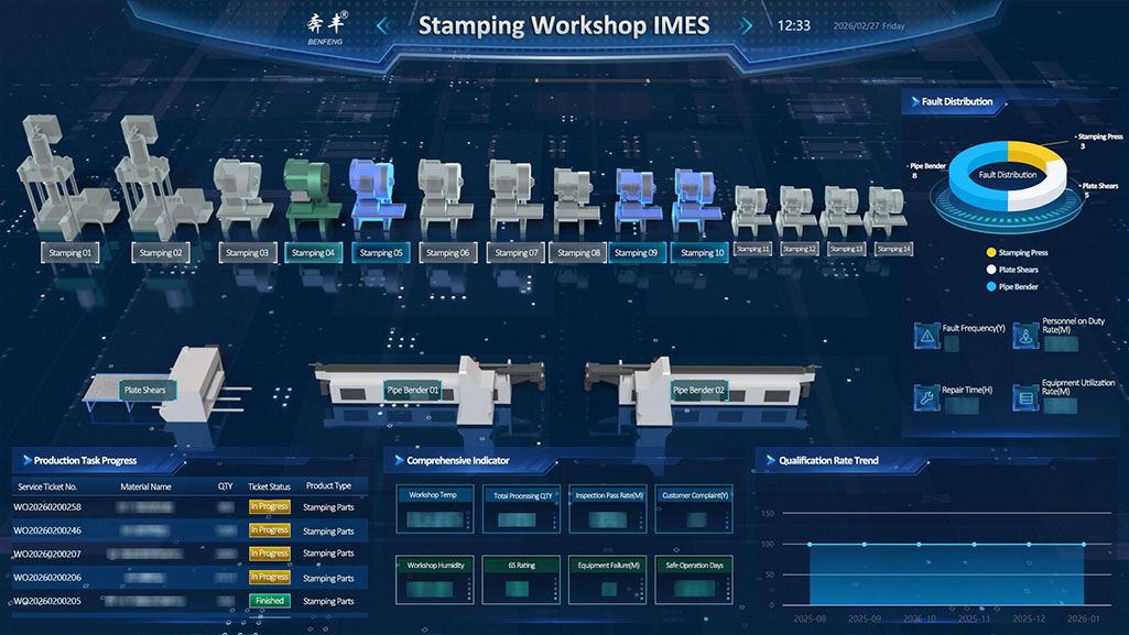 An pointe tosaigh lárnach chun frámaí suíocháin a fhoirmiú. Feistithe le líne táirgeachta stampála beachtas, ag brath ar ardán IMES chun monatóireacht a dhéanamh ar pharaiméadair phróisis i bhfíor-am, ag cinntiú cruinneas agus comhsheasmhacht gach cuid stampála, ag leagan bunús cnámharlaigh iontaofa le haghaidh próisis ina dhiaidh sin.